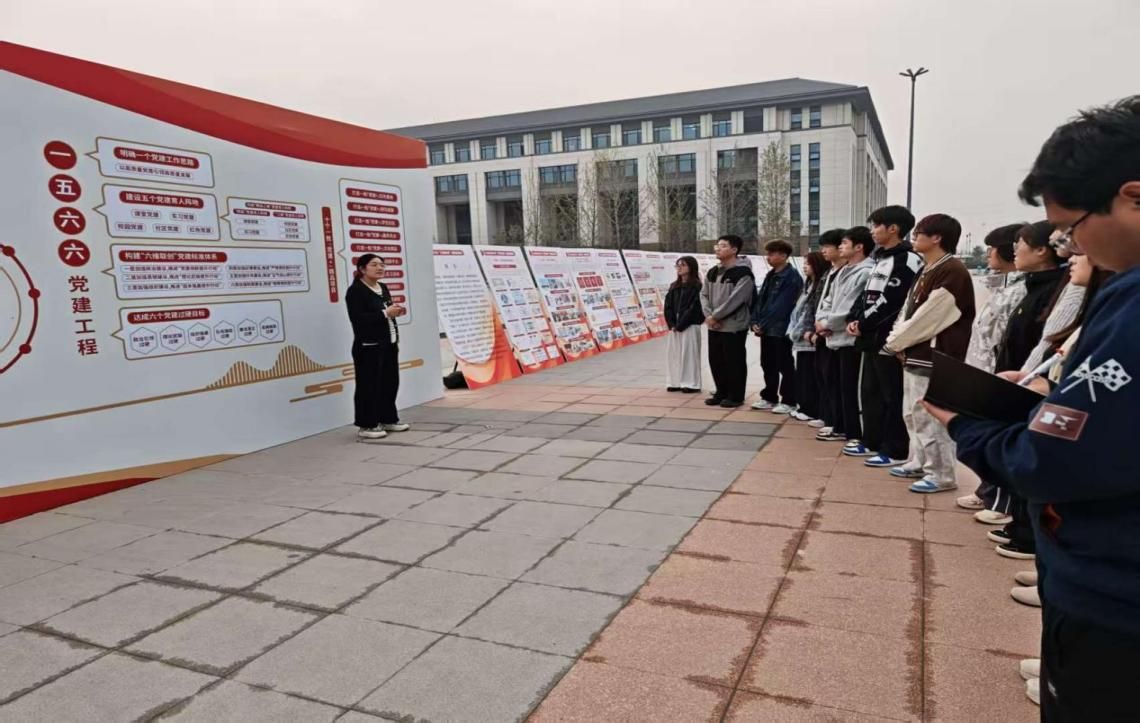 活动伊始,张丽娜副书记结合展板内容,系统讲解了学校党委围绕“服务地质行业、服务地方发展”的“双地”办学定位,实施 “1566”党建工程,打造“红耀双地”党建品牌的丰硕成果。同时,她围绕学院党建根基夯实、党建制度完善、党建活动开展及党建特色培育等方面,详细介绍了学院响应学校“红耀双地”党建品牌建设的具体举措与实际成效。在随后的自由参观环节,学生党员们三五成群驻足研讨,有的拍摄展板内容留存学习,有的分享自身感悟与思想收获,现场学习氛围浓厚热烈。