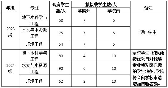2023级、2024级我们地下水科学与工程专业、水文与水资源工程专业、环境工程专业拟接收转入学生51人,具体各专业分配情况见表1。