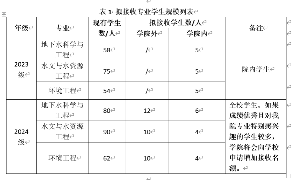 2023级、2024级我们地下水科学与工程专业、水文与水资源工程专业、环境工程专业拟接收转入学生61人,具体各专业分配情况见表1。